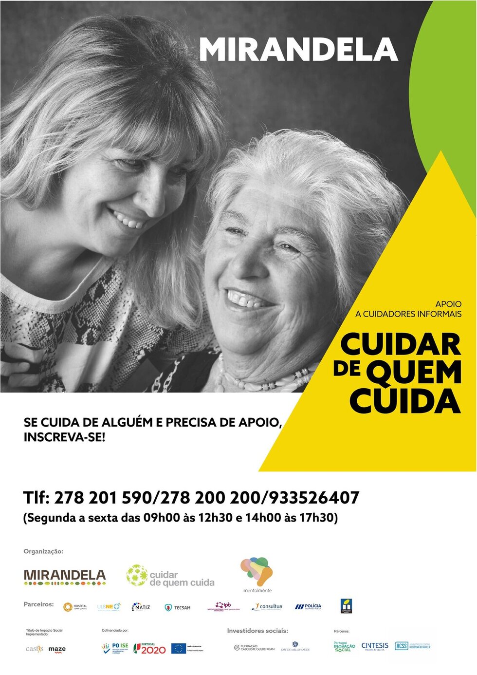 "Cuidar de Quem Cuida" mantêm-se abertas as inscrições para o grupo Psicoeducativo "Cuidar de Quem Cuida" para Cuidadores Informais, uma vez por semana, durante sensivelmente dois meses, Cuidadores Informais tem a oportunidade de fazer parte de um grupo Psicoeducativo, onde uma equipa multidisciplinar dá "formação" e apoio a estes cuidadores, com o intuito de capacitá-los para as necessidades do seu dia a dia, bem como estratégias de comunicação, e auto cuidado.