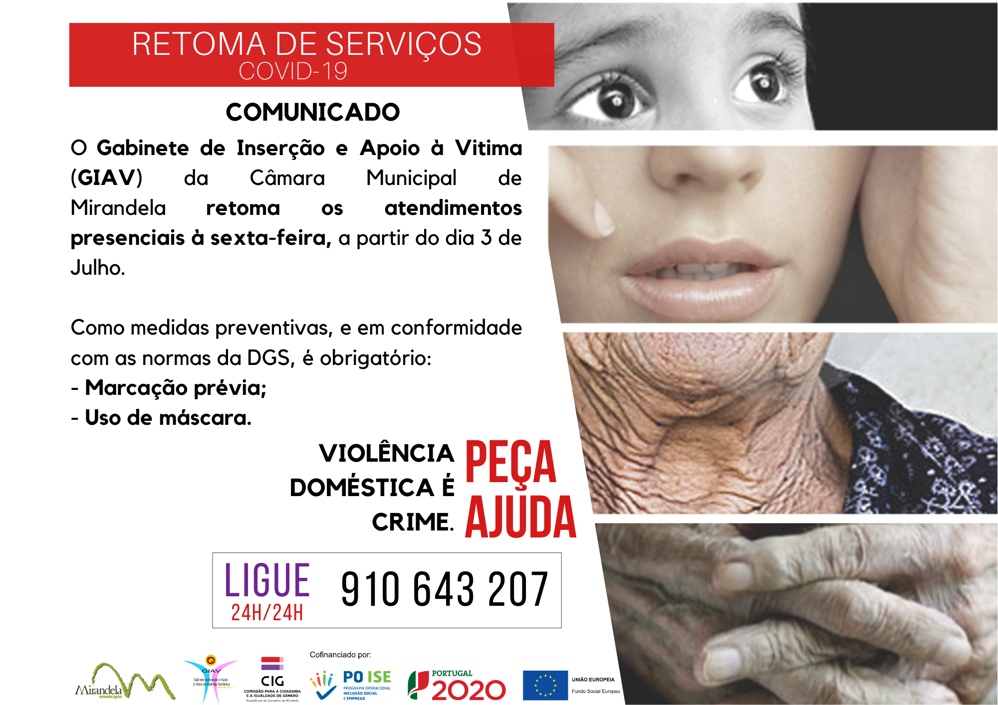 O Gabinete de Inserção e a Apoio à Vítima (GIAV) da Câmara Municipal de Mirandela retoma os atendimentos presenciais à sexta-feira, a partir do dia 3 de julho.