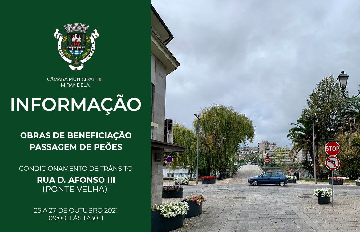 Informação | Condicionamento de trânsito na Rua D. Afonso III (Ponte Velha) devido a obras de beneficiação da passagem de peões - de 25 a 27 de outubro, entre as 09:00h e as 17:30h.