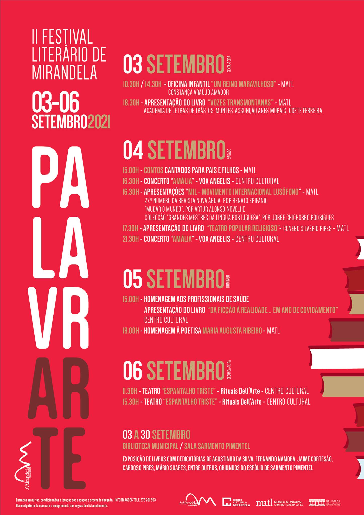 A segunda edição do PalavrArte apresenta-se num formato descentralizado, visitando os equipamentos culturais da cidade Mirandela. O programa de 2021 conta com as mais variadas formas de utilização da palavra: música, teatro, literatura, contos e oficinas.