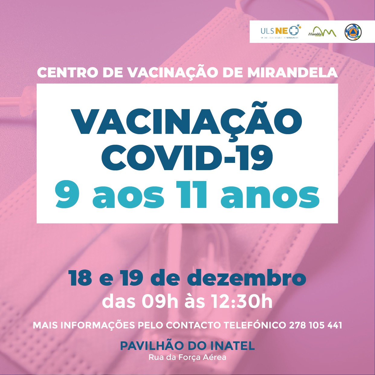 O Centro de Vacinação de Mirandela convida as crianças, com idades compreendidas entre os 9 e 11 anos e devidamente acompanhadas pelos pais/encarregados de educação, a vacinar-se contra a Covid-19, durante este fim de semana, dias 18 e 19 de dezembro, entre as as 09:00h e as 12:30h.