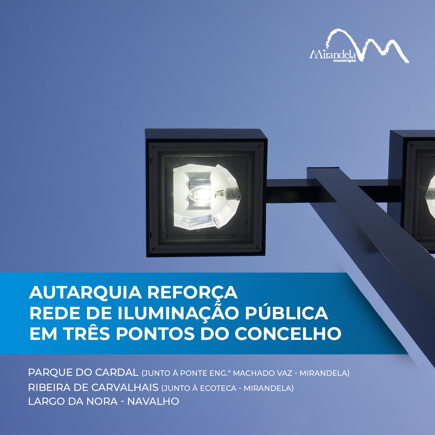Com o objetivo de dotar os espaços públicos de maiores condições de segurança, a Câmara Municipal de Mirandela assinou, a 15 de fevereiro, o auto de consignação da empreitada que prevê a instalação de novas luminárias, de tecnologia LED, no Largo da Nora, na aldeia de Navalho, no Parque de Estacionamento do Cardal (junto à ponte Eng.º Machado Vaz em Mirandela), e na margem direita da Ribeira de Carvalhais (junto à Ecoteca de Mirandela).