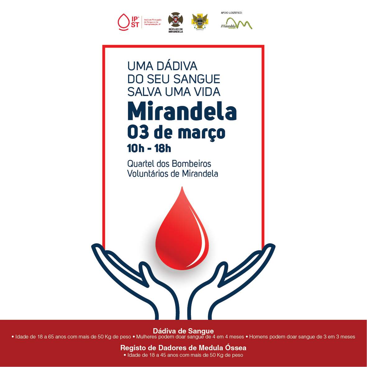 Dádiva de sangue em Mirandela. O seu gesto pode manter a sua vida e de muitos outros! ❤️ 03 de março | 10h - 18h | Quartel dos Bombeiros Voluntários de Mirandela