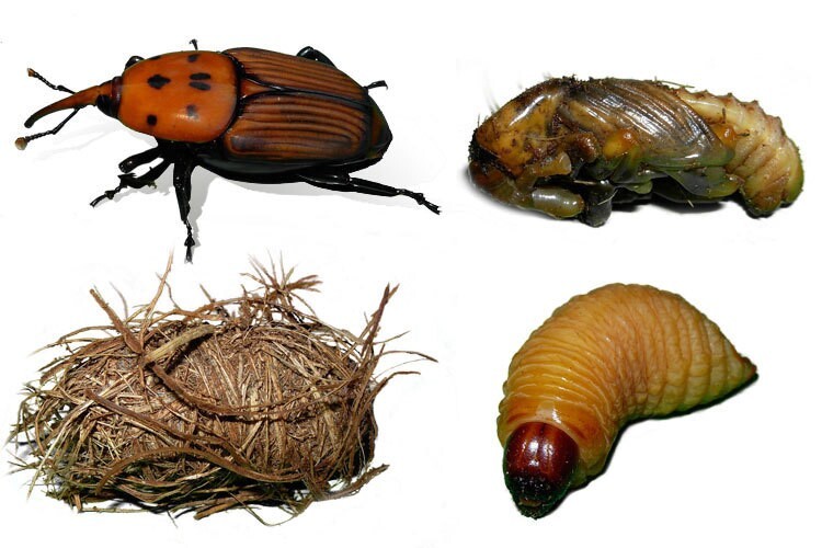 De nome científico Rhynchophorus ferrugineus (Olivier) é também conhecido como "escaravelho da palmeira" ou "escaravelho vermelho". É originário das zonas tropicais da Ásia e Oceânia e é um coleóptero da família doscurculionídeos, que ataca diversas espécies de palmeiras, provocando estragos que podem conduzir à morte das plantas. Atualmente encontra-se disperso por diversas regiões do território nacional.