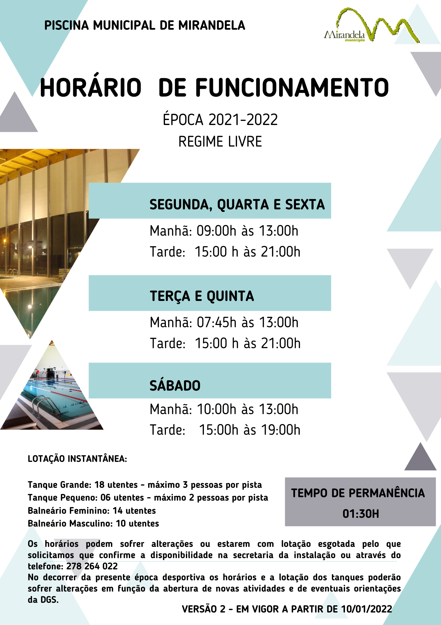 A partir do próximo dia 10 de janeiro de 2022, a Piscina Municipal de Mirandela passará a dispor de um novo horário de funcionamento.
