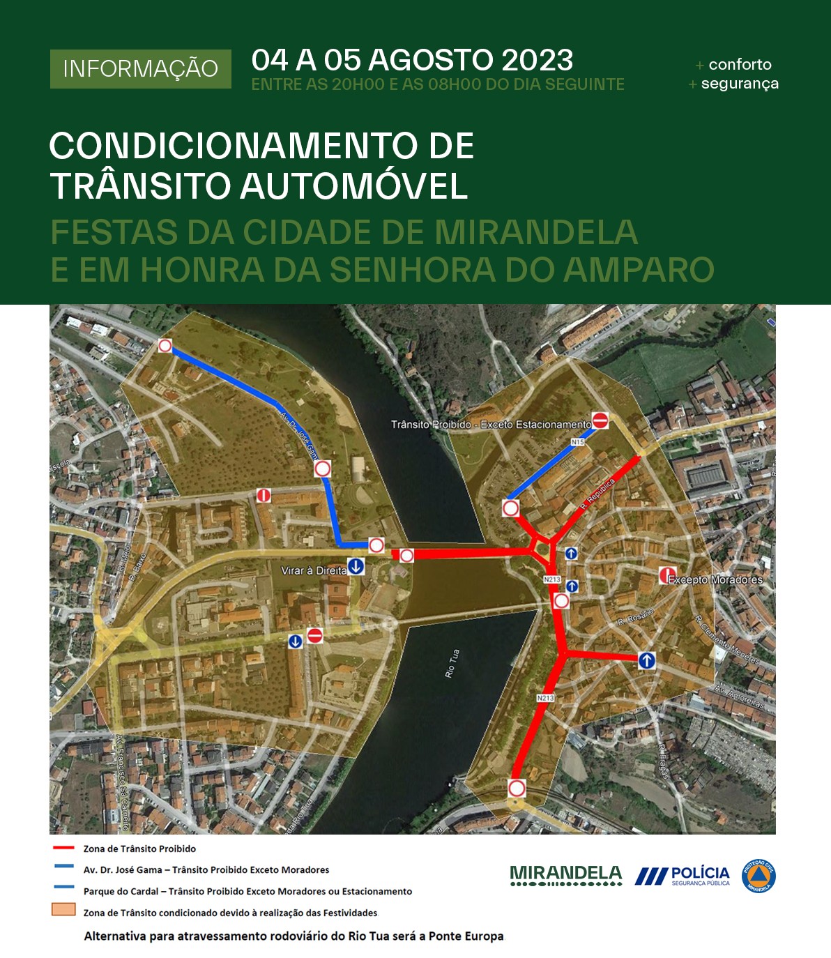 Condicionamento de trânsito automóvel nos dias 04 e 05 de agosto de 2023 (entre as 20h00 e as 08h00 do dia seguinte) - Noite dos Bombos e Noite do espetáculo de fogo de artifício - Festas da Cidade de Mirandela e em honra de Nossa Senhora do Amparo