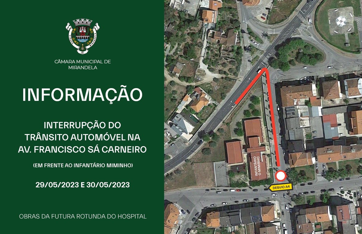 Informação | No âmbito da empreitada de construção da futura Rotunda do Hospital Público, informa-se que será necessária a interrupção do trânsito automóvel na Av. Francisco Sá Carneiro, em frente ao infantário Miminho nos dias 29/05/2023 e 30/05/2023, para a execução de trabalhos de pavimentação.