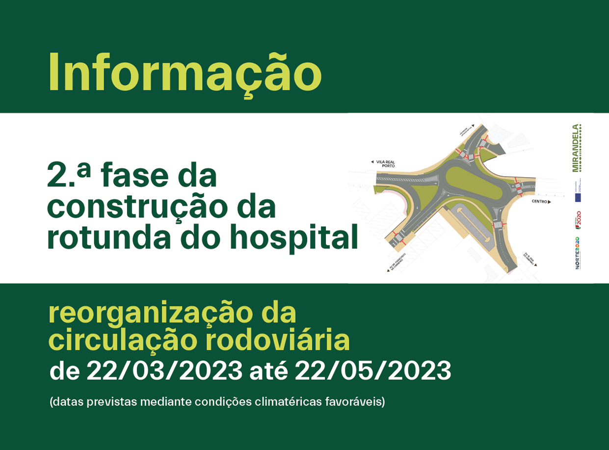 Segunda fase de construção da nova rotunda do Hospital exige reorganização da circulação automóvel. Com início marcado para o dia 22 de março, as entradas e as saídas alternativas da cidade de Mirandela poderão ser consultadas nos mapas disponibilizados.