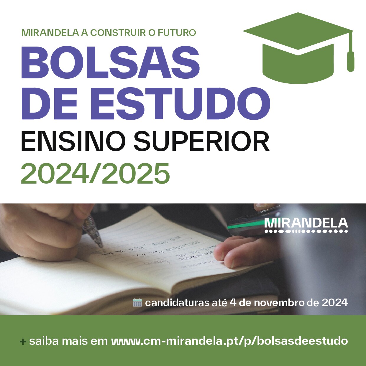 Os alunos interessados em candidatar-se às bolsas de estudo devem cumprir critérios de elegibilidade, que incluem a residência no concelho de Mirandela e a inscrição num curso de Ensino Superior em Portugal. Toda a informação sobre o processo de submissão de candidaturas (de 06 de setembro a 04 de novembro de 2024) poderá ser consultada em https://www.cm-mirandela.pt/p/bolsasdeestudo.