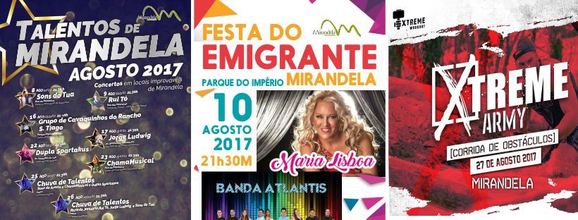 A Festa do Emigrante é já no dia 10 de agosto, a partir das 21h30, no Parque do Império e é uma homenagem da Câmara Municipal de Mirandela aos emigrantes que tradicionalmente nos visitam nesta época do ano. O cartaz é composto por duas atuações: a Maria Lisboa e a Banda Atlantis, a não perder.