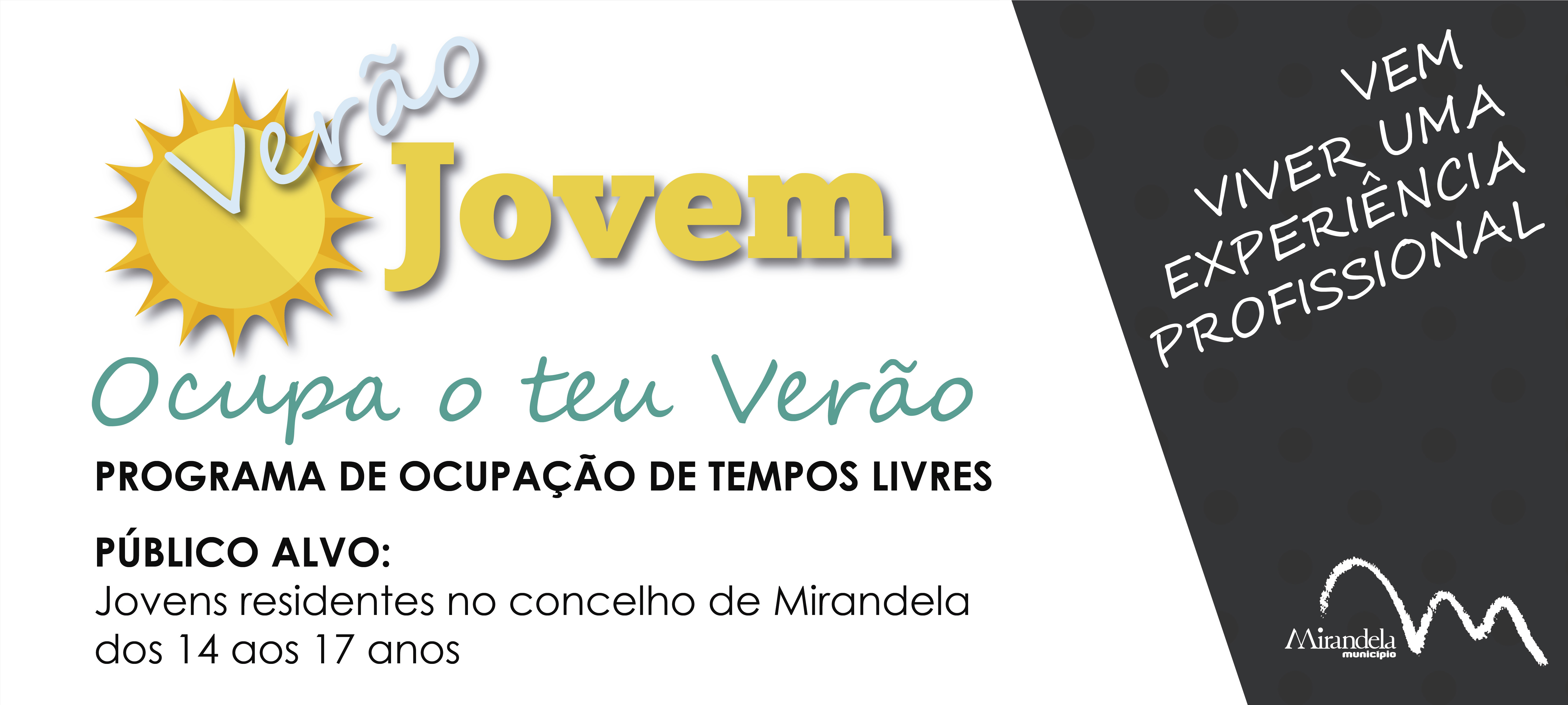 Pelo segundo ano consecutivo, a Câmara Municipal de Mirandela promove o programa de ocupação de tempos livres “Verão Jovem” com o objetivo de orientar os jovens do concelho para o desempenho de atividades ocupacionais que permitam o contacto experimental com a vida profissional, designadamente o trabalho autárquico e institucional, preparando-os para o mundo laboral e, simultaneamente, potenciar a sua participação social.