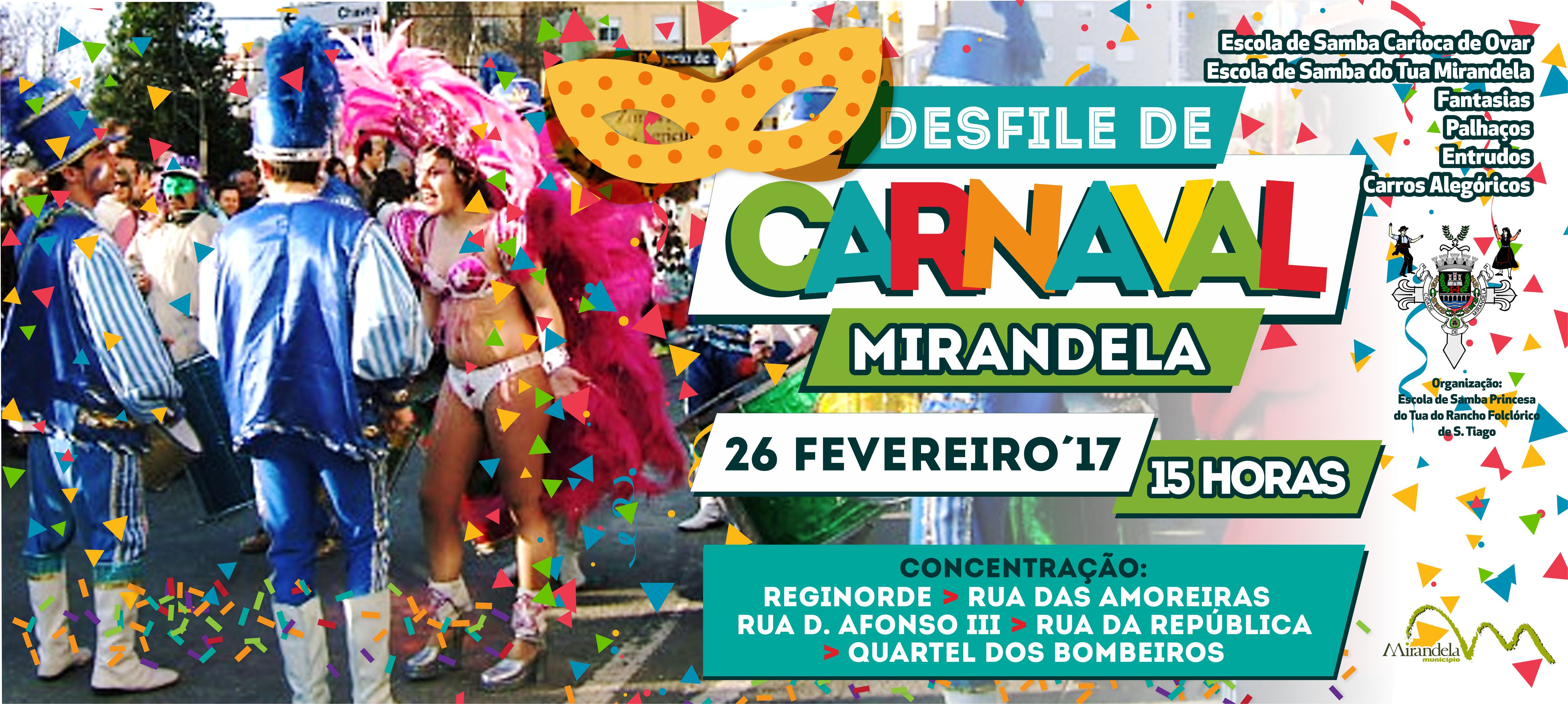O Carnaval está de regresso às ruas de Mirandela pela mão da Escola de Samba Princesa do Tua do Rancho Folclórico de S. Tiago, com a diligência e o apoio da Câmara Municipal de Mirandela.