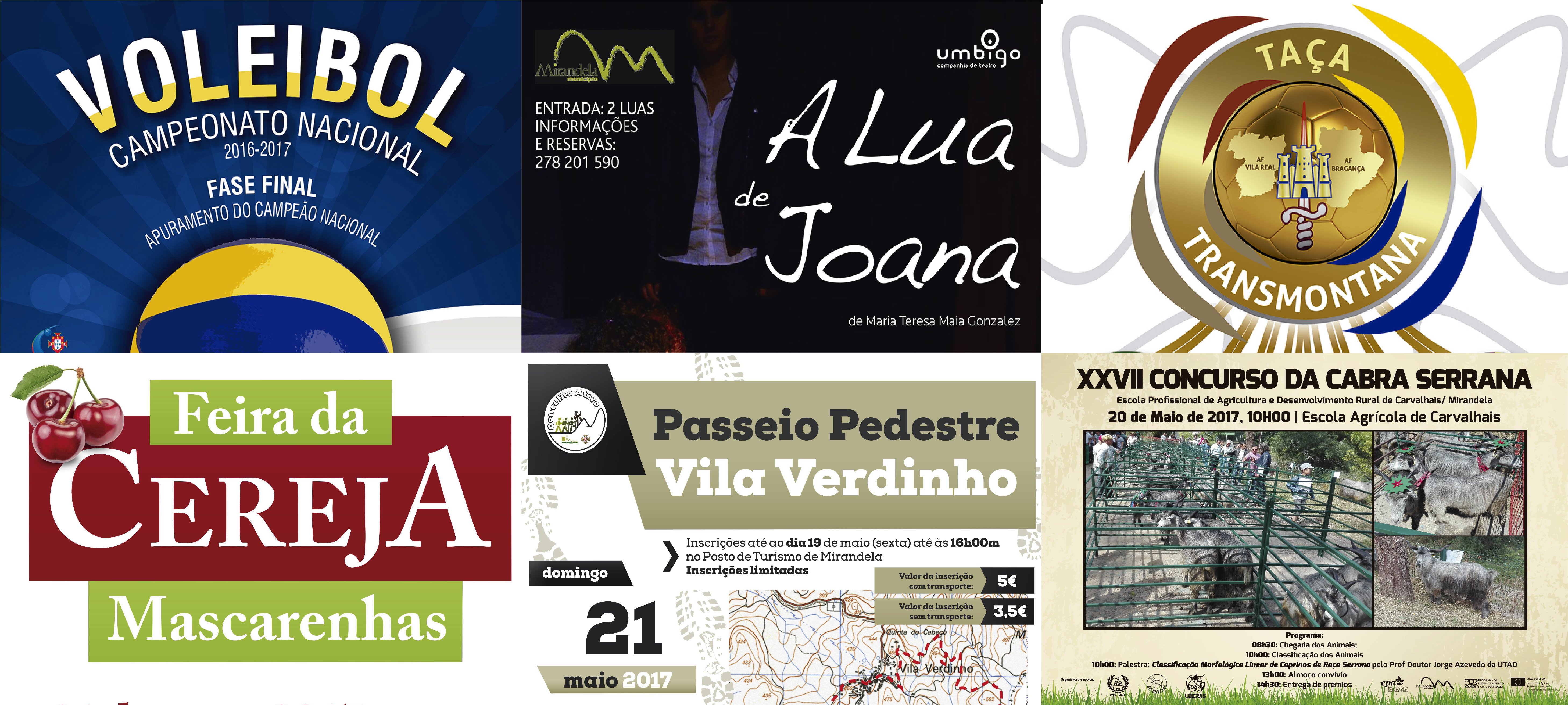 No sábado, dia 20 de maio, tem início às 10 horas o XXVII Concurso da Cabra Serrana na Escola Agrícola de Carvalhais/Mirandela e prossegue a Fase Final do Apuramento do Campeão Nacional de Voleibol que inicia na sexta-feira e se prolonga até domingo no INATEL e Escola Secundária de Mirandela, marcando o início da Semana da Juventude e Desporto de Mirandela 2017. Para os amantes de teatro, há ainda a peça “A Lua de Joana” baseada no best seller de Maria Teresa Maia Gonzalez, às 21 horas, no Auditório Municipal.