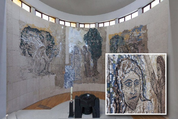 O painel de 7,55 m x 15,70 da autoria do escultor Manuel Rosa e da pintora Ilda David é composto por mosaicos vindos de todas as partes do mundo: os azuis do Brasil, os amarelos da China, os pretos das Bélgica, os vermelhos da Espanha e os verdes da Índia, contando ainda com mármores e calcários de várias zonas de Portugal. Do painel, surgem elementos como a água, a luz, o perdão, a caridade e a hospitalidade. Todos eles elementos que nos reportam para o Sacramento da Iniciação Cristã que é o Batismo.