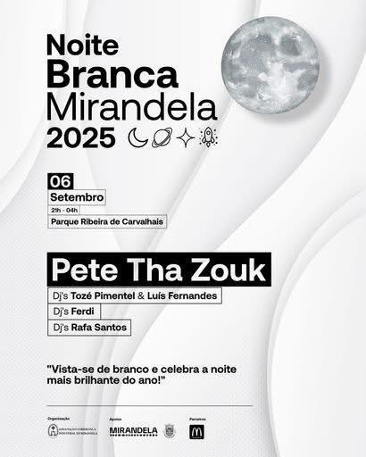 No cartaz, destaque para Pete Tha Zouk, um dos DJs mais aclamados do país, que promete fazer vibrar a cidade. A festa continua com atuações de Tozé Pimentel & Luís Fernandes, Ferdi e Rafa Santos.