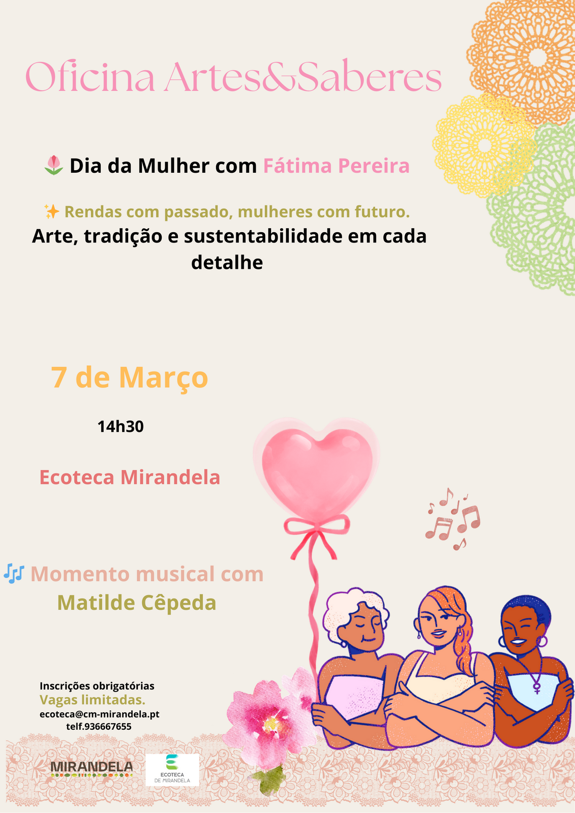 No dia 7 de março, pelas 14h30, a Ecoteca de Mirandela abre as suas portas para uma tarde especial dedicada ao Dia da Mulher. Sob o mote "Rendas com passado, mulheres com futuro", o evento conta com a participação de Fátima Pereira, que guiará os participantes numa jornada onde a arte, a tradição e a sustentabilidade se cruzam em cada detalhe.