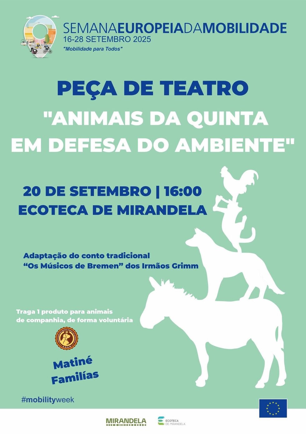 No próximo sábado, 20 de setembro, às 16h00, a Ecoteca de Mirandela recebe a peça "Animais da Quinta em Defesa do Ambiente", uma adaptação do conto tradicional Os Músicos de Bremen, dos Irmãos Grimm.